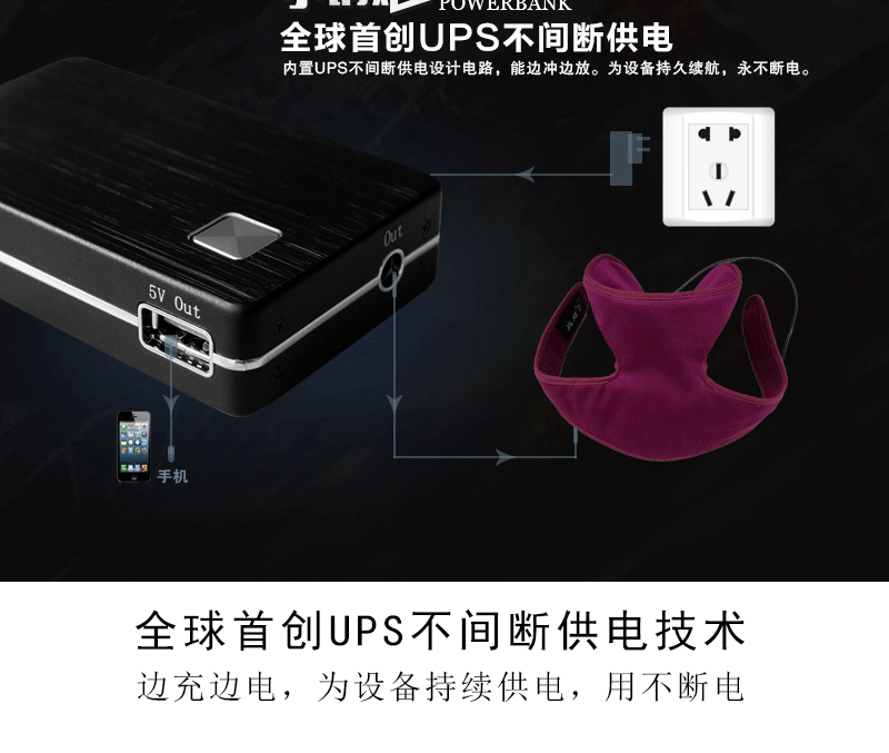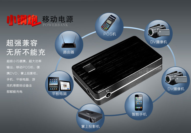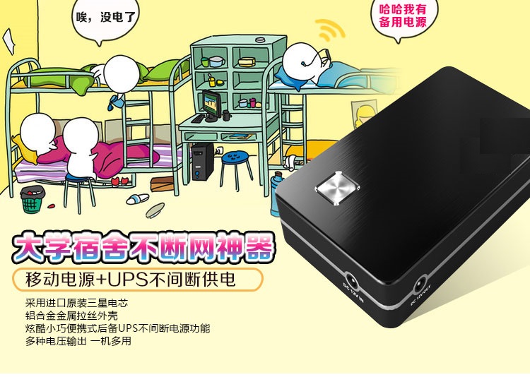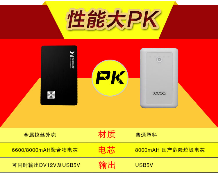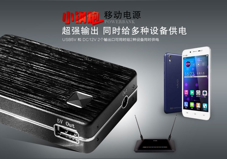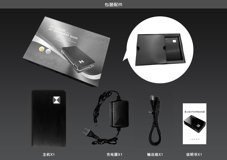 【商品概述】采用UPS不间断供电技术,DC12v和USB5v双电压输出,最大输出功率60W,电源容量6600mah/8000mah,加之小巧玲珑,超强的工业设计感,是名副其实的“小钢炮”;