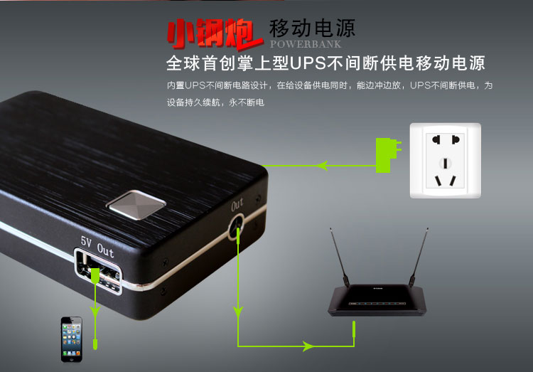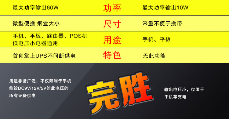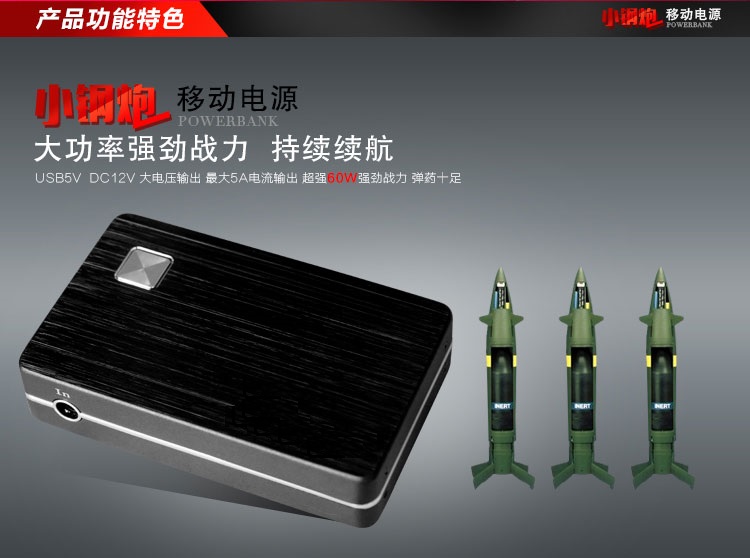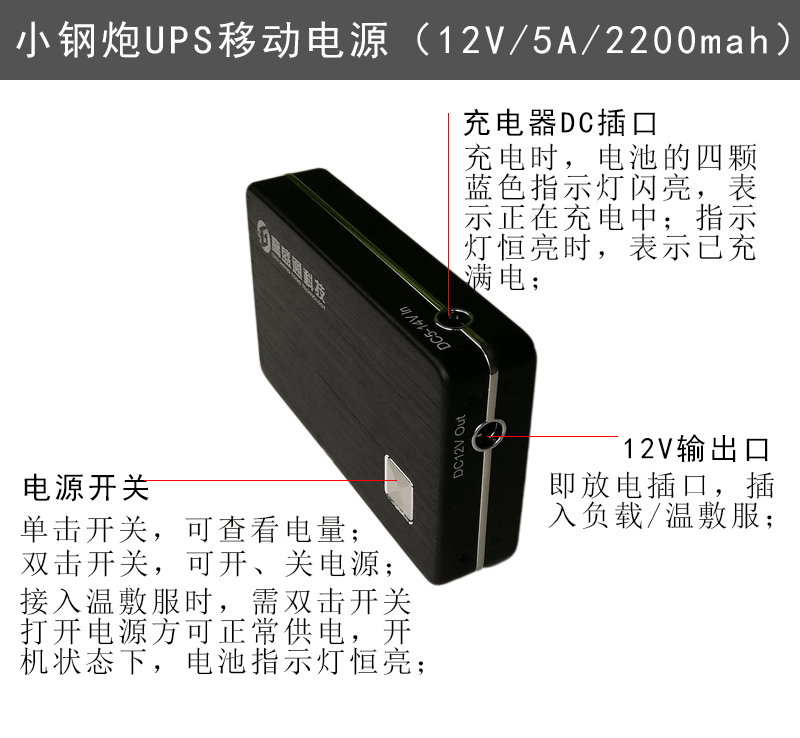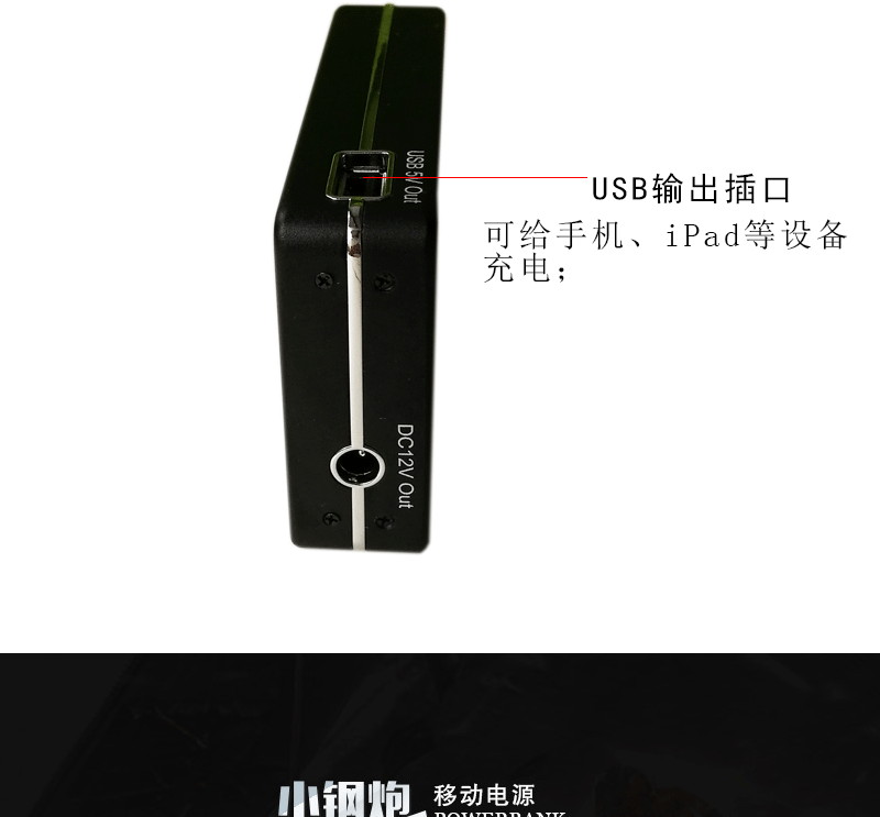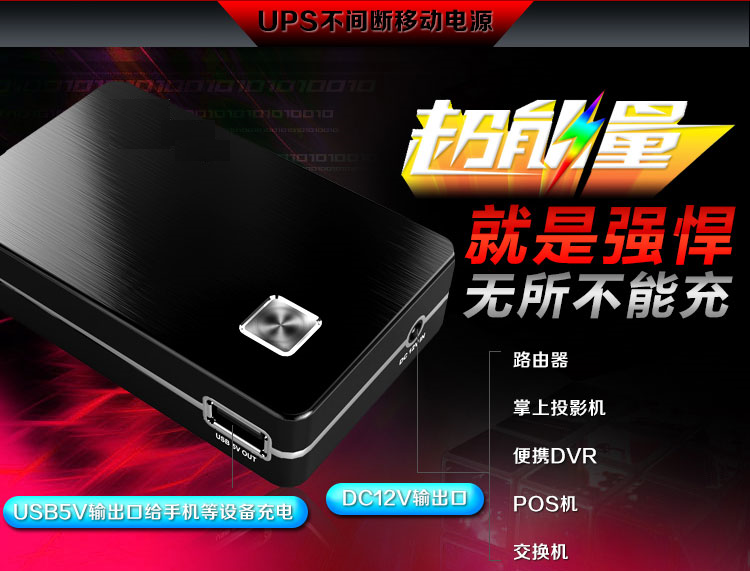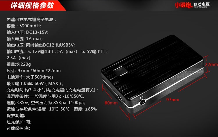 【商品概述】采用UPS不间断供电技术,DC12v和USB5v双电压输出,最大输出功率60W,电源容量6600mah/8000mah,加之小巧玲珑,超强的工业设计感,是名副其实的“小钢炮”;